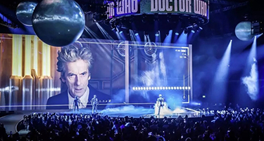 活動策劃團隊使用了6百萬、250萬和300萬的Pufferspheres,在舞臺和觀眾之上再現(xiàn)了BBC的全球新標志。Kinesys被用來移動球形的投影表面,上面安裝了Barco 30k投影儀,讓Hawthorn可以在整個精心設(shè)計的表演中改變令人印象深刻的物理雕塑的高度。